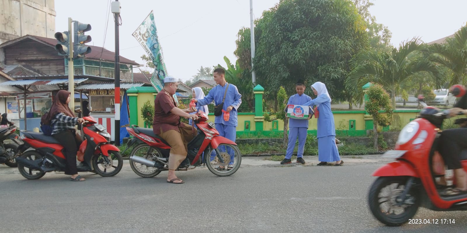 Kegiatan berbagi takjil juga tampak di daerah tugu kapal simpang urung. Beberapa siswa yang tergabung dalam Organisasi PASKIBRA membagikan takjil kepada pengguna jalan saat mendekati waktu berbuka, Rabu (12/04/2023).