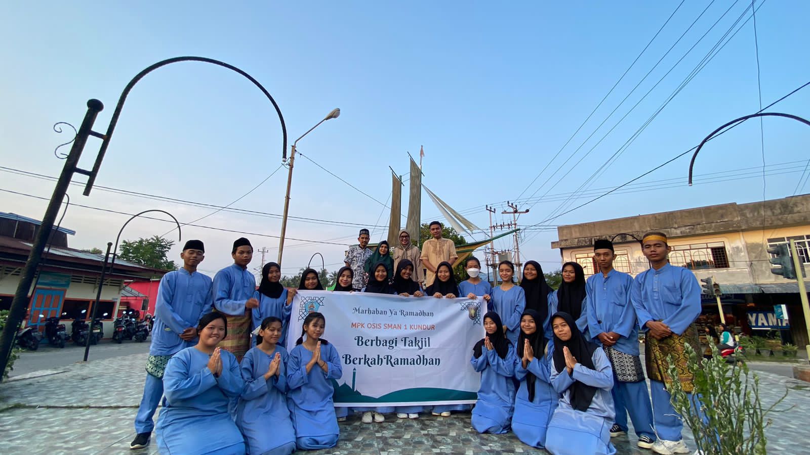 Kegiatan berbagi takjil juga tampak di Tugu Kapal simpang urung. Beberapa siswa yang tergabung dalam Organisasi Siswa Intra Sekolah (OSIS), MPK Majelis Perwakilan Kelas serta Pembina dan Wakil Pembina MPK Osis terlihat membagikan takjil kepada pengguna jalan saat mendekati waktu berbuka, Kamis (13/04/2023).