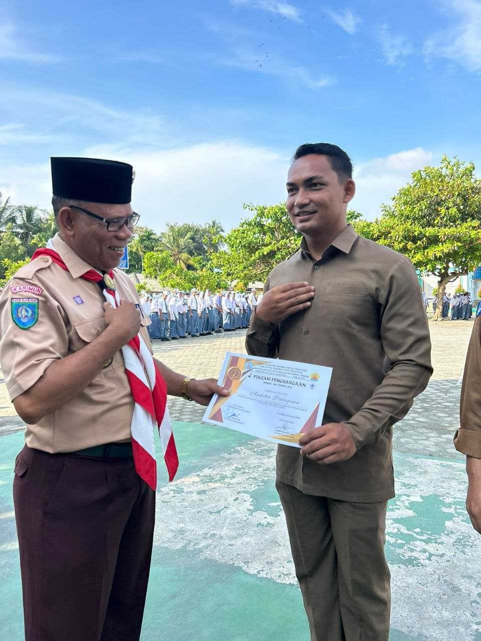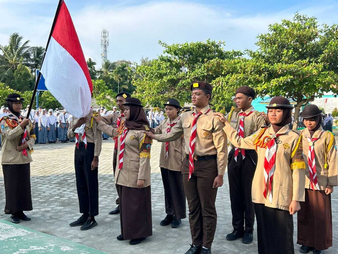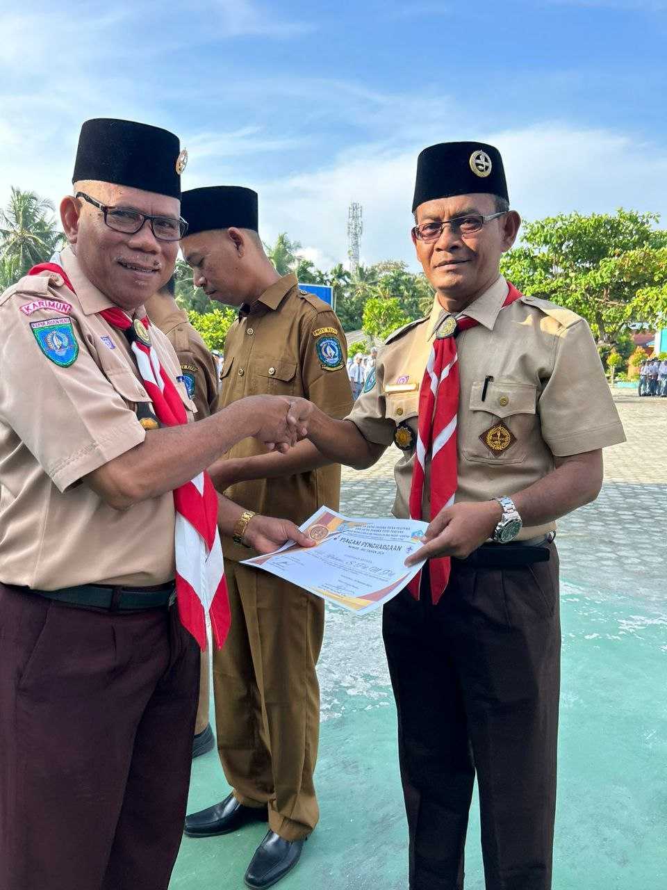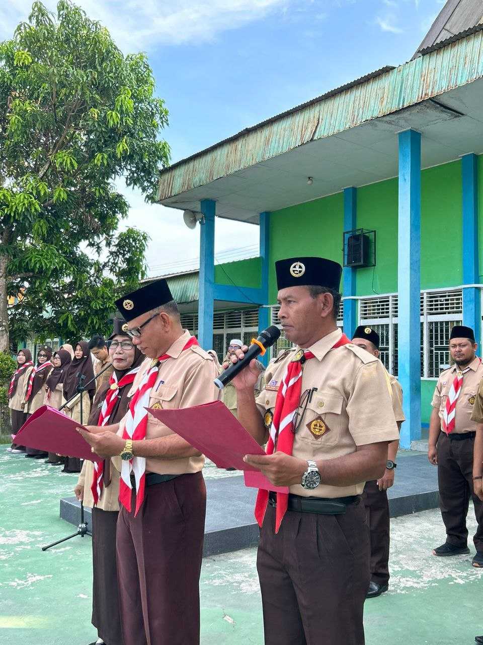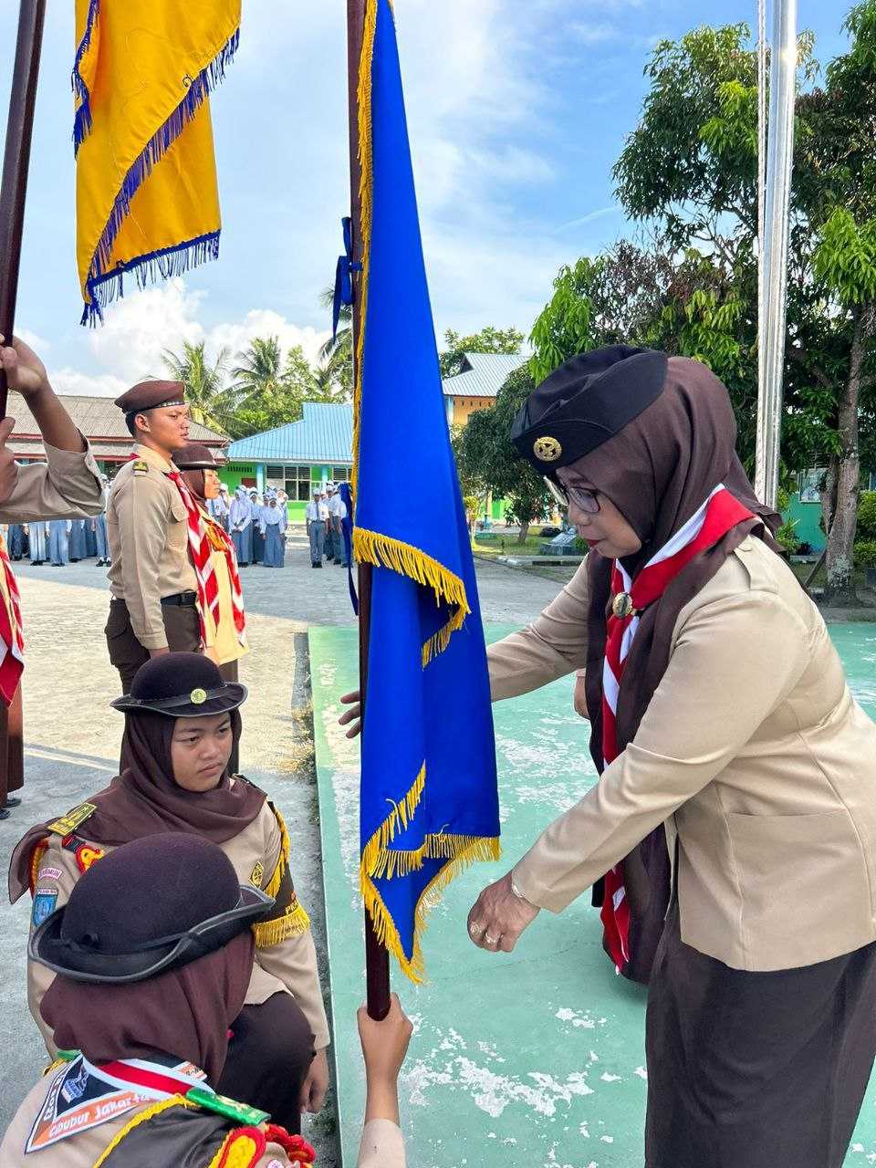 Kak Rahayu Kusrianti,S.Pd, M.Pd - Ka.Kwarran 02 Kundur di dampingi Kamabigus dan Pembina Gudep melantik pengurus Dewan Ambalan Satya Darma Putra Pradana dan Satya Darma Putri Pradana Gudep 02.055 - 02.056 tahun 2024 di Lapangan Upacara, Senin (26/02/2024).